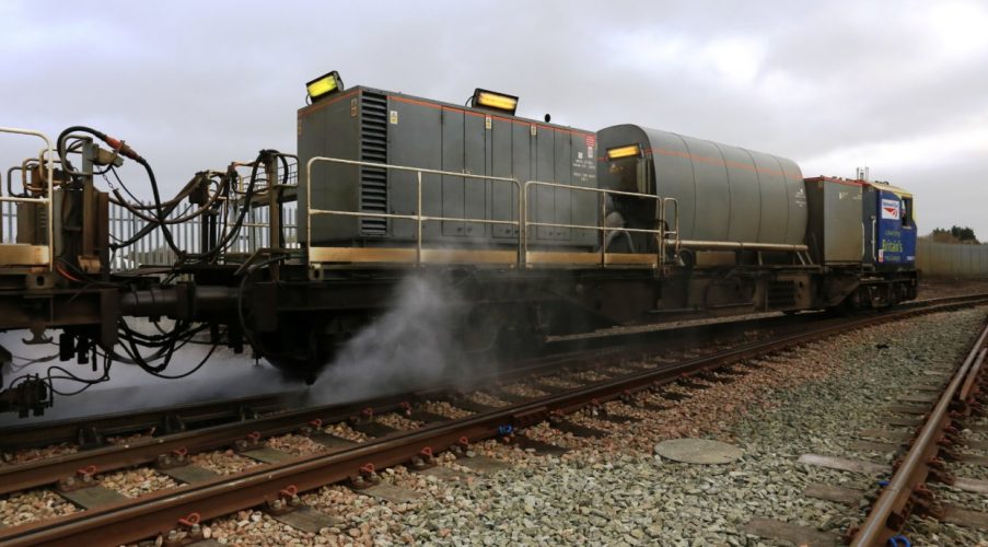 然后,他们在铁轨上涂上一层黏附改性剂——一种由悬浮凝胶、沙子和钢铁或铁丸混合而成的混合物——来帮助列车牵引力,帮助列车正常运行。