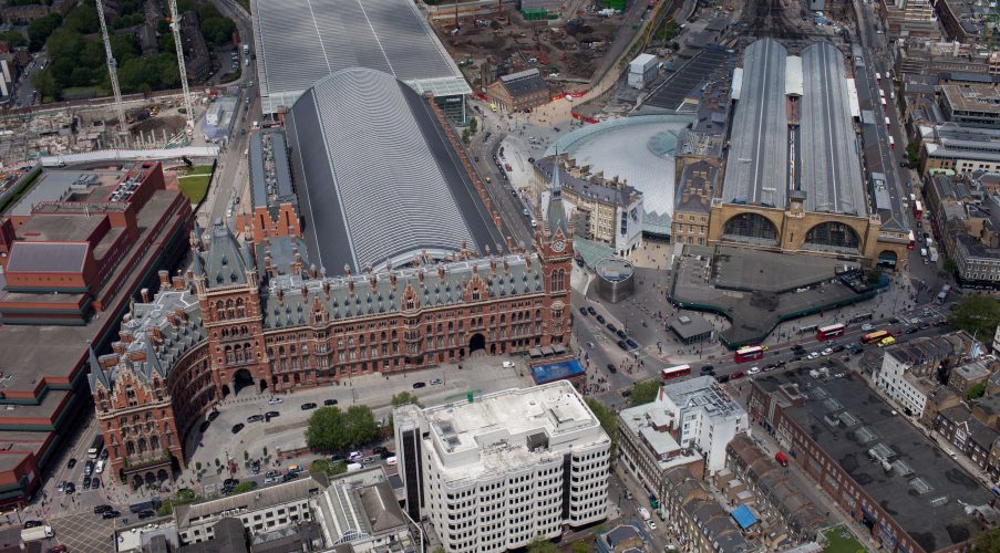 1865年,举行了一场比赛,设计车站的正面,包括一个新的酒店。乔治·吉尔伯特·斯科特(George Gilbert Scott)是当时最著名的哥特式建筑师,尽管他的设计超出了规定的尺寸,但他还是赢得了比赛。